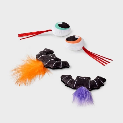 Give your kitty hours of fun with the 4-Pack Eyeball Cat Plush Toy Set from Boots & Barkley™. This pack of four cat toys includes two eyeballs with play tassels and two black bats with feathers. Made of soft fabric, the toys are filled with catnip to get them extra excited for energetic play.