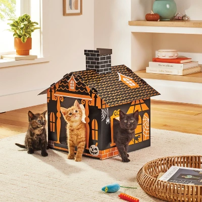 This 18.5-Inch Halloween Haunted House Cat Scratcher House from Boots & Barkley™ is the purr-fect Halloween hangout spot for your feline friend. Made from cardboard, this cat scratcher is designed to resemble a haunted house, featuring a scratch-ready floor to help keep their claws neatly groomed. It features cut-out door openings and colorful, eerie Halloween designs on the walls and roof in orange, black, and white hues, creating a creepy-cool hideout for your kitty to curl up and relax.